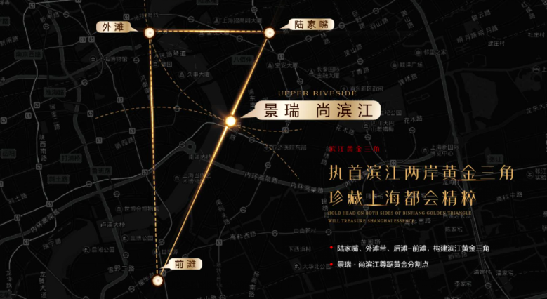 景瑞尚滨江项目雄踞陆家嘴一线滨江,地处陆家嘴核心地段,靠近陆家嘴金融板块,地理位置得天独厚。在国宾级道路浦明路上,做为连接陆家嘴南北向最重要的一条纽带,浦明路周边豪宅林立,寸土寸金,素有上海的“最贵1英里”之称。