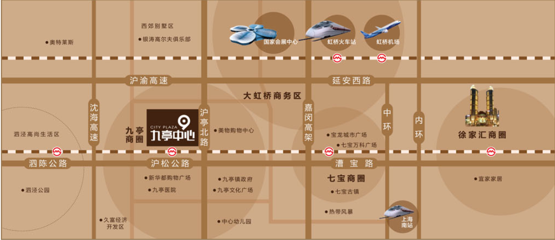 轨交:9号线九亭地铁站 购物:巴黎春天、华伦天奴购物中心、华联、农工商、易初莲花七宝店、家乐福七宝店、乐购七宝店,新华都购物广场、摩力盛汇生活广场、贝尚坊市场生活中心 邮局:九亭邮电局 医疗:松江人民医院九亭分院、朝华医院 餐饮:肯德基 金融:中国建设银行、中国工商银行、中国农业银行、上海银行、浦东发展银行 其他:奥林匹克运动中心、银七星滑雪场