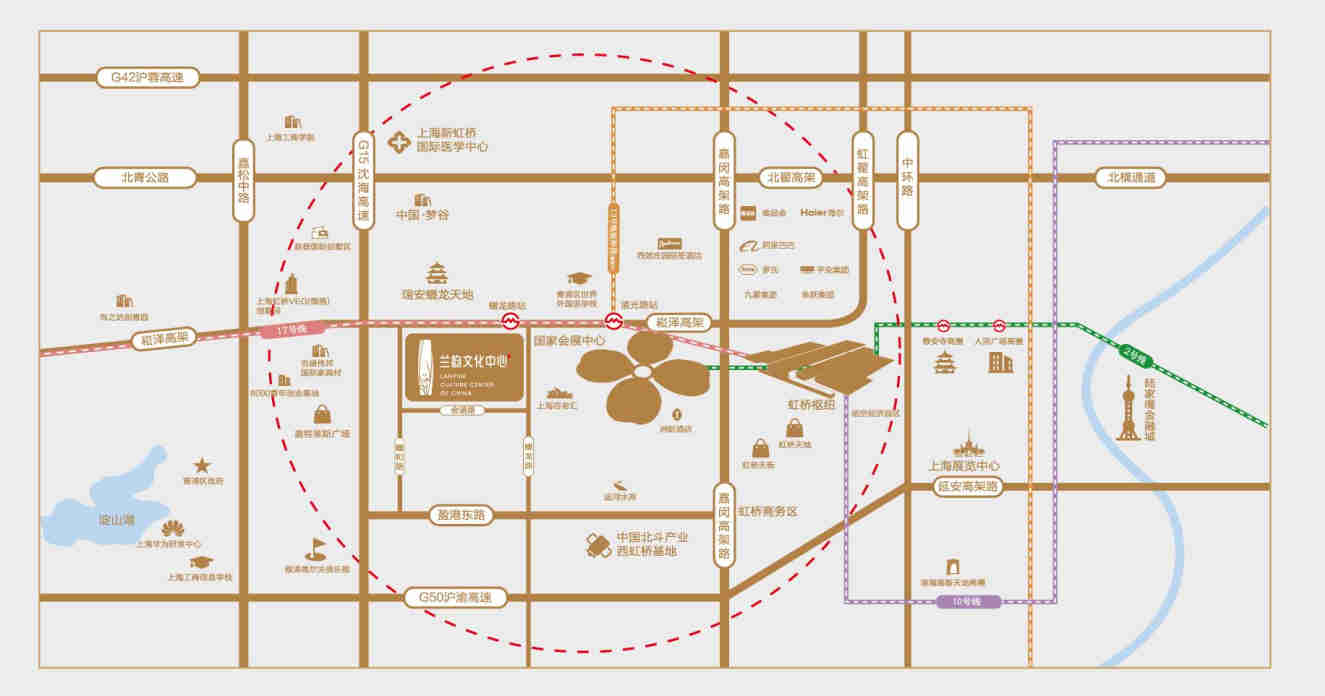 兰韵文化中心位于虹桥商务区核心地块,距国家会展中心约1.5公里,虹桥交通枢纽约3.9公里,零距离对接地铁蟠龙路站。