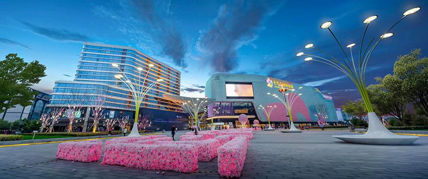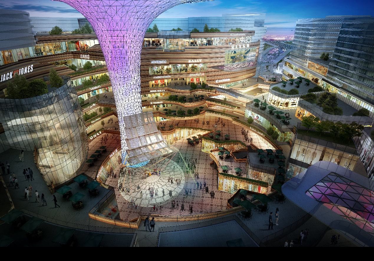 项目以中心广场为核心,打造以欧美、亚洲、全球为主题的三条街区、两个环路,将大mall与街区有机结合,不分彼此,打造共生共赢的商业场所。