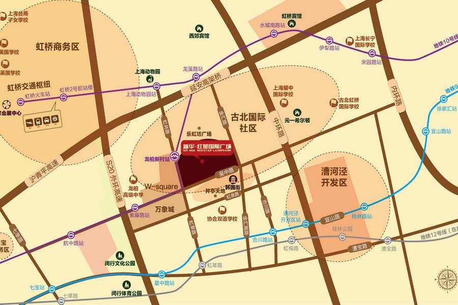 新华·红星国际广场项目是由“新华发行”和“红星地产”,两大上市公司联手投资百亿重金打造的上海商业壹号作品!项目南临吴中路、西靠虹井路、北沿先锋街、东近金汇路,位于大虹桥商务区、古北板块和徐家汇商圈的交汇点,属于吴中路商圈的中心位置。