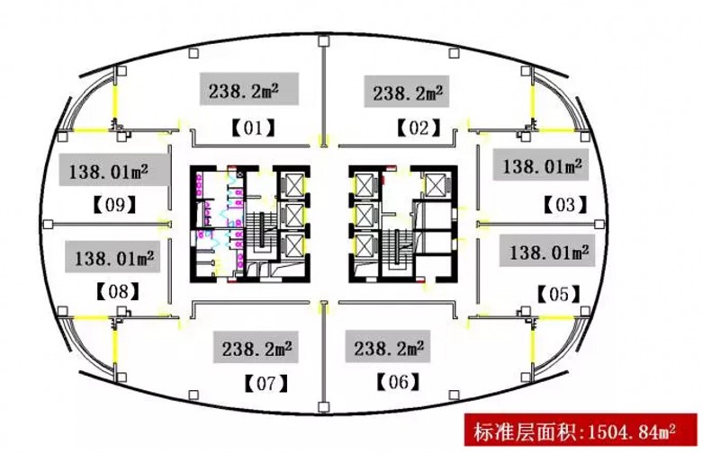 标准层面积:1504.84m2(建筑面积)