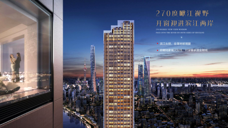 本项目外观为ARTDECO海派建筑风格建筑,外立面采用“黄金麻”石料,和滨江沿线所有楼盘外立面颜色相呼应,保持一线滨江的整体性,同时也采用三层保暖材料和中空双层玻璃LOWE落地窗,地上、地下双大堂设计,整体的设计包括外观、大堂、室内都出自世界著名酒店设计公司HBA之手,并聘请国际级物业商CBRE(世邦魏理仕)提供专属礼宾服务以及24小时酒店式物业管理服务;更配备了如嘉格纳、库博士、维宝等国际顶尖厨卫品牌,缔造品质生活,彰显豪宅风范。